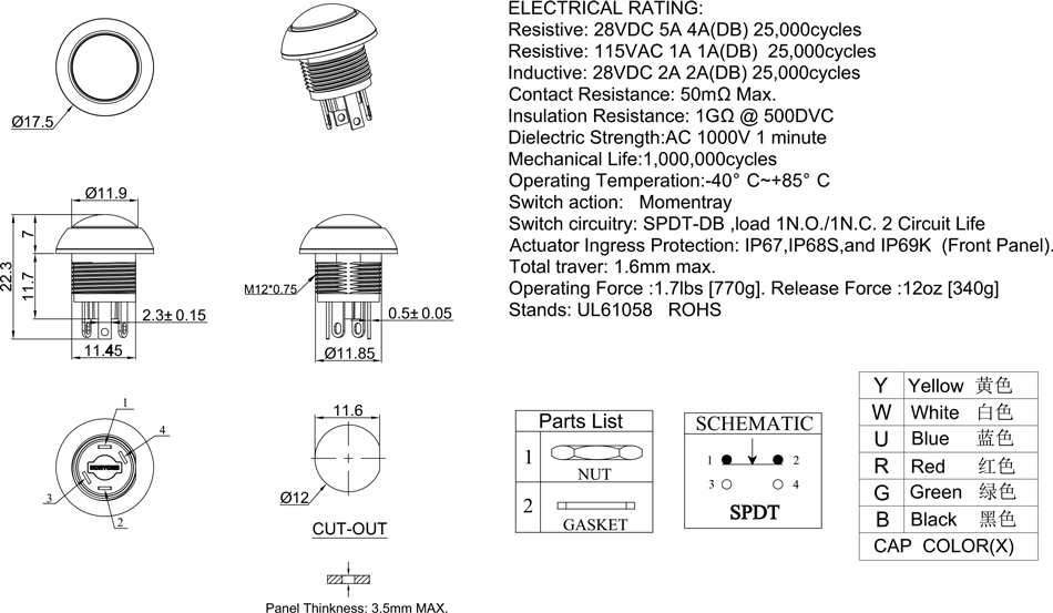 Resistive: 115VAC,60Hz 3A 1A(DB)25,000cycles