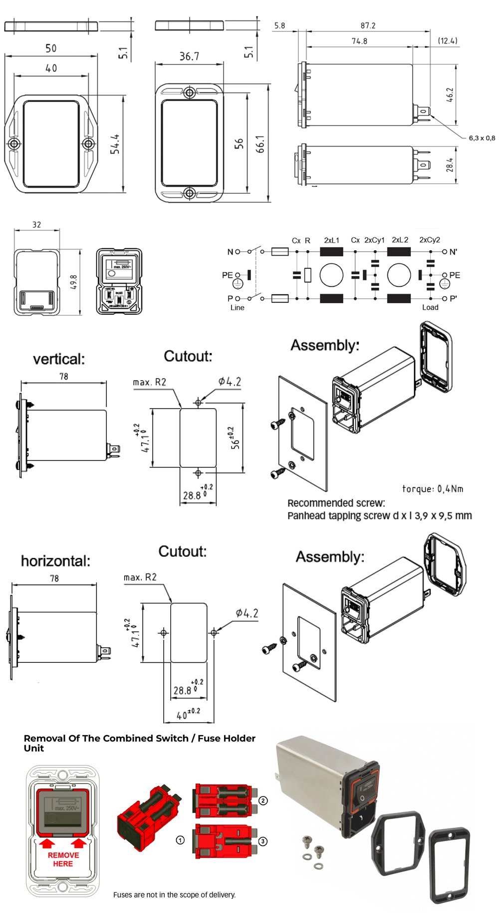 Fuse holder: 2 fuses (?5 x 20 mm) max. 250 V