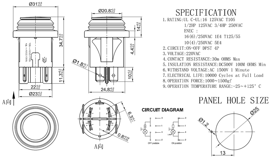 10(4)/250VAC5E4 CIRCUIT:ON-OFF DPST 4P
