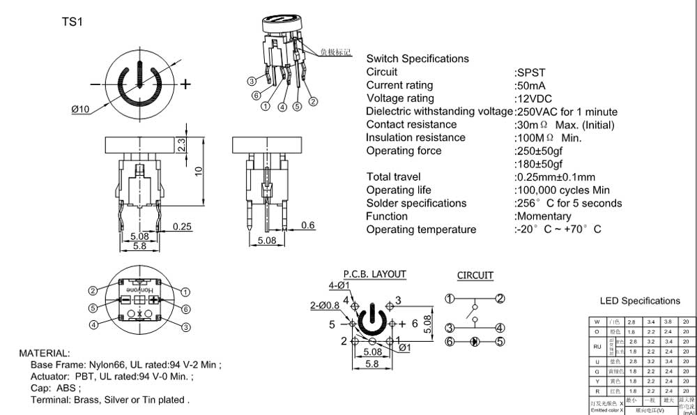 Operating Force :180±50gf or 250±50gf