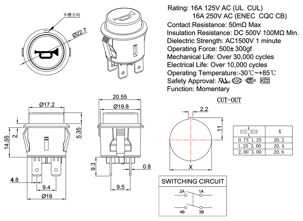 Rating: 16A 125V AC (UL CUL)