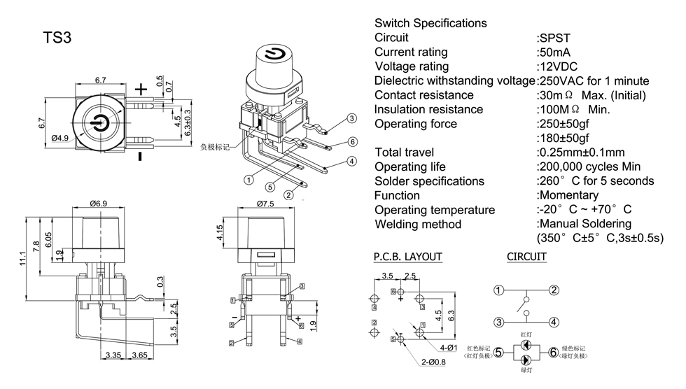 Operating Force :180±50gf or 250+50gf